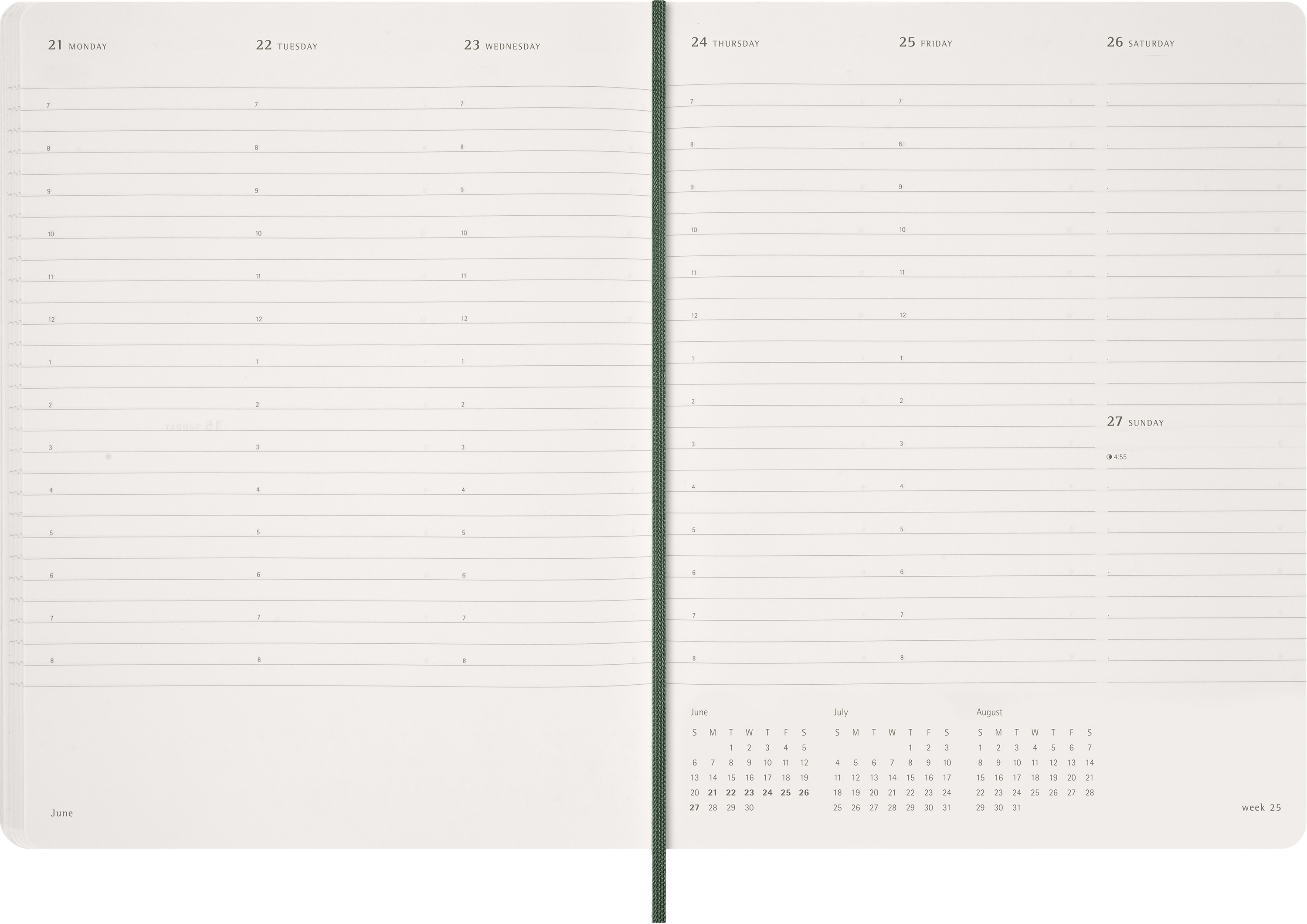 Cet agenda mince et élégant au design Moleskine incomparable a une couverture souple mais robuste. À l'intérieur, chaque semaine est représentée sur deux pages. Les jours de la semaine sont affichés verticalement, avec des cases horaires pour vos T