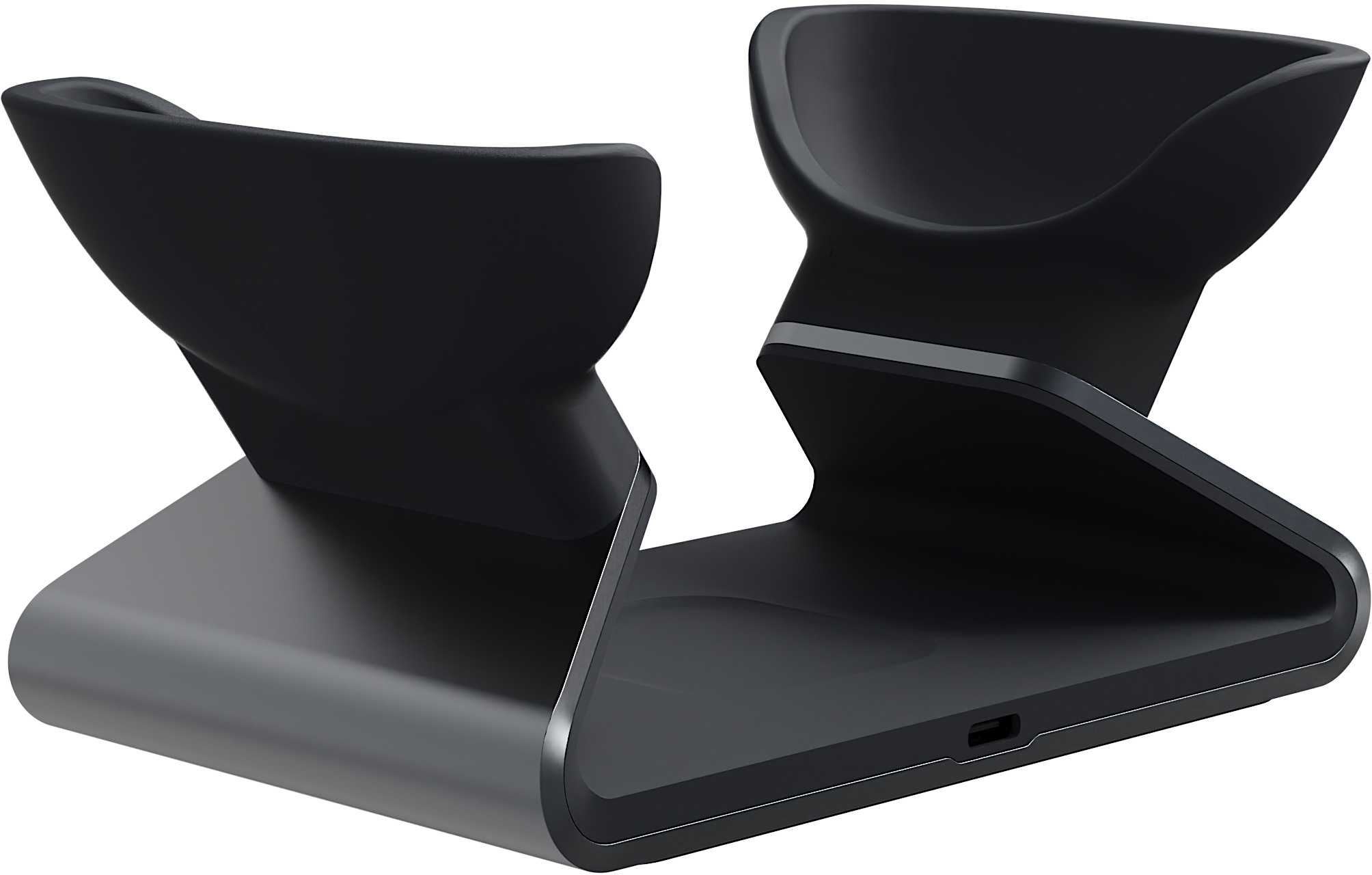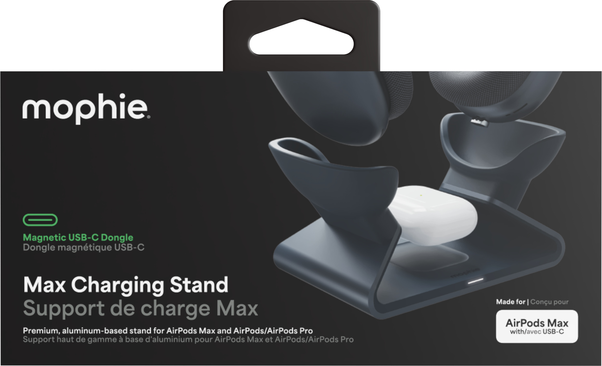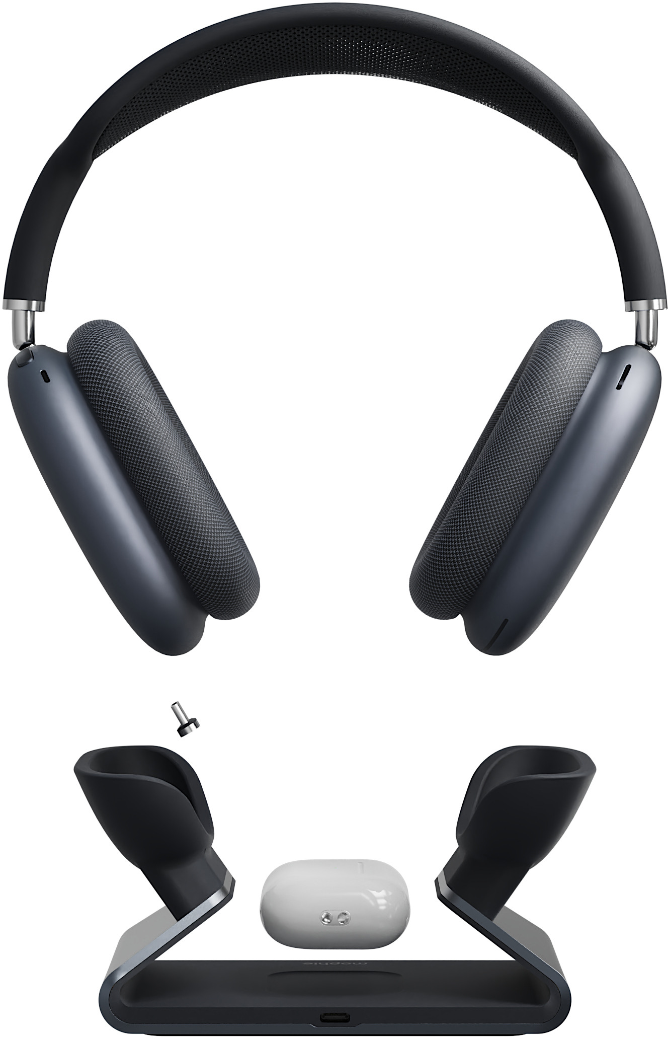 La station de charge AirPods Max est la maison idéale pour tes écouteurs. Cette élégante station de charge sans fil alimente à la fois tes écouteurs et tes AirPods. Et elle offre un emplacement de rangement spécial pour que tu saches toujours où ils se trouvent. Pour recharger tes AirPods Max, il te suffit de brancher le câble USB-C fourni, puis de les placer dans les coques en silicone du support. Pour recharger tes écouteurs AirPods/AirPods Pro, il te suffit de les poser sur la surface de chargement sans fil du support. Le témoin lumineux t'indique quand le chargement a commencé. Le support de charge AirPods Max a un design audacieux et minimaliste qui s'intègre bien dans votre pièce. Sa qualité se reflète dans la finition artisanale de la base en aluminium, des coussinets souples en silicone et de l'USB-C en silicone.