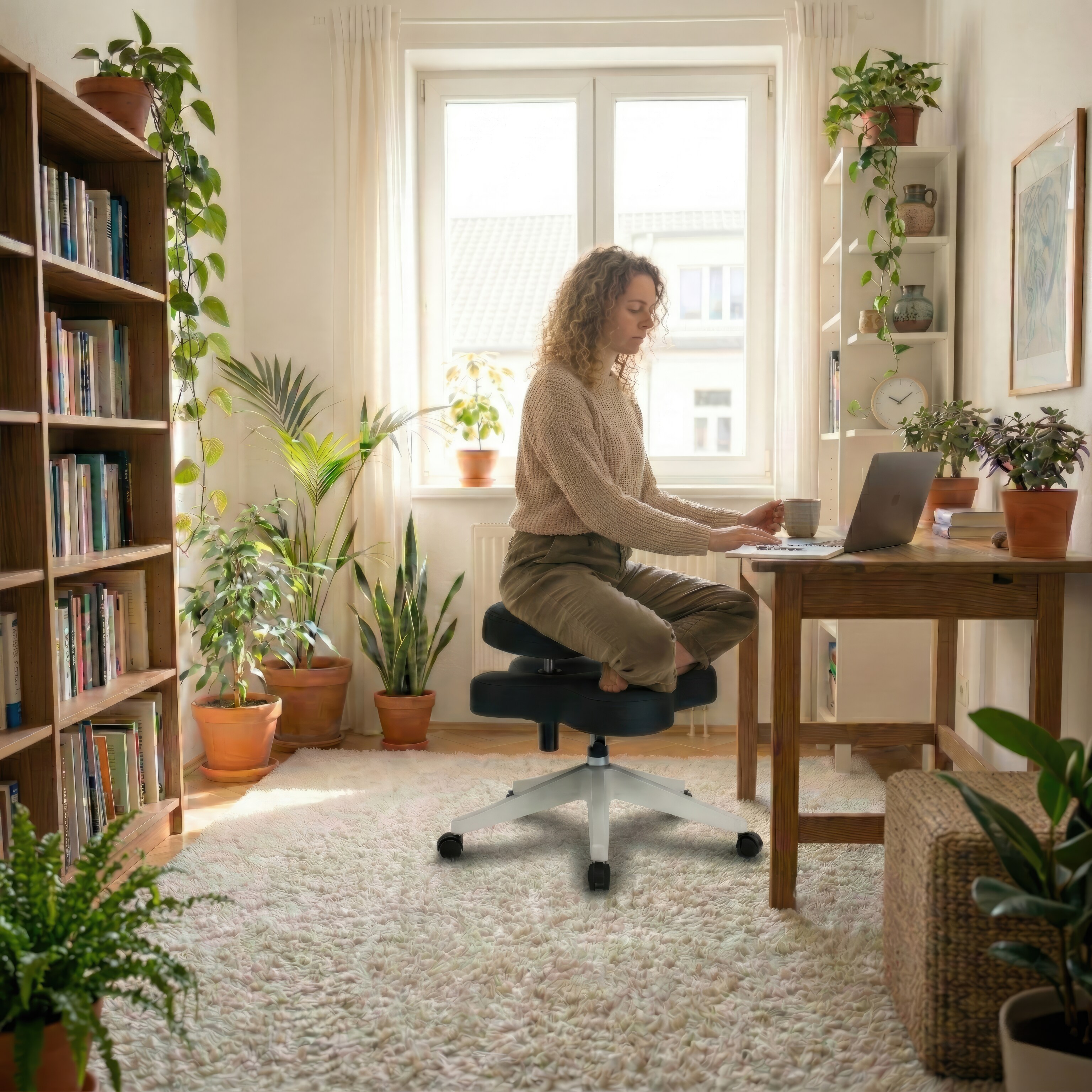 Trouve ton équilibre entre le travail et la pleine conscience - avec le "SUKHA" pour une assise moderne. Que ce soit au bureau à domicile, en méditant ou pendant ta pratique du yoga. Le "SUKHA" favorise une posture naturelle et droite et soutient ton bien-être physique et mental. Cette Cross-Legged Chair a été spécialement conçue pour les personnes qui aiment travailler ou se détendre en tailleur ou dans des positions assises alternatives. Le tabouret t'offre la plus grande liberté possible pour travailler, sans aucune restriction. Une position assise prolongée sur des chaises de bureau traditionnelles peut entraîner des tensions et des malaises. Le Cross-Legged Chair te permet de t'asseoir de manière flexible et dynamique, ce qui favorise la circulation sanguine et améliore ta posture. Elle est parfaite pour tous ceux qui souhaitent vivre et travailler en toute conscience. Cette chaise est plus qu'un simple meuble - c'est une déclaration pour un style de vie attentif. Que tu travailles dans ton bureau à domicile, que tu fasses une petite pause pour méditer ou que tu te prépares à ta prochaine séance de yoga, la Cross-Legged Chair t'accompagne et apporte plus de calme, de concentration et de mobilité dans ton quotidien.