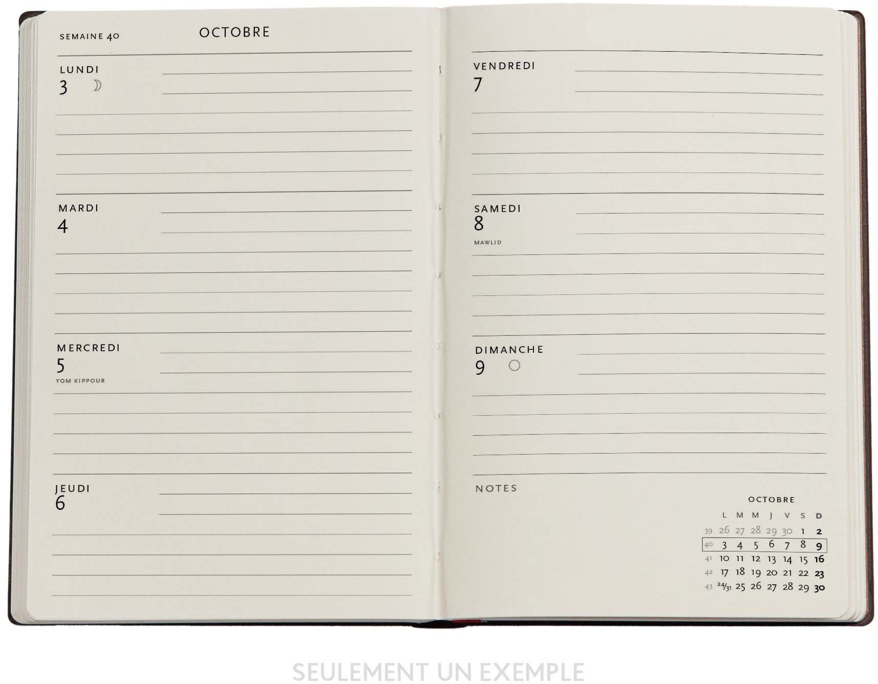 Avec couverture de livre en matériau européen 100% recyclé. Papier sans acide provenant de forêts exploitées de manière durable. Papier couché lisse qui absorbe proprement l'écriture. Reliure Smyth de haute qualité. Inclus un carnet d'adresses amovible. Deux rubans de lecture et poches intérieures à soufflet.