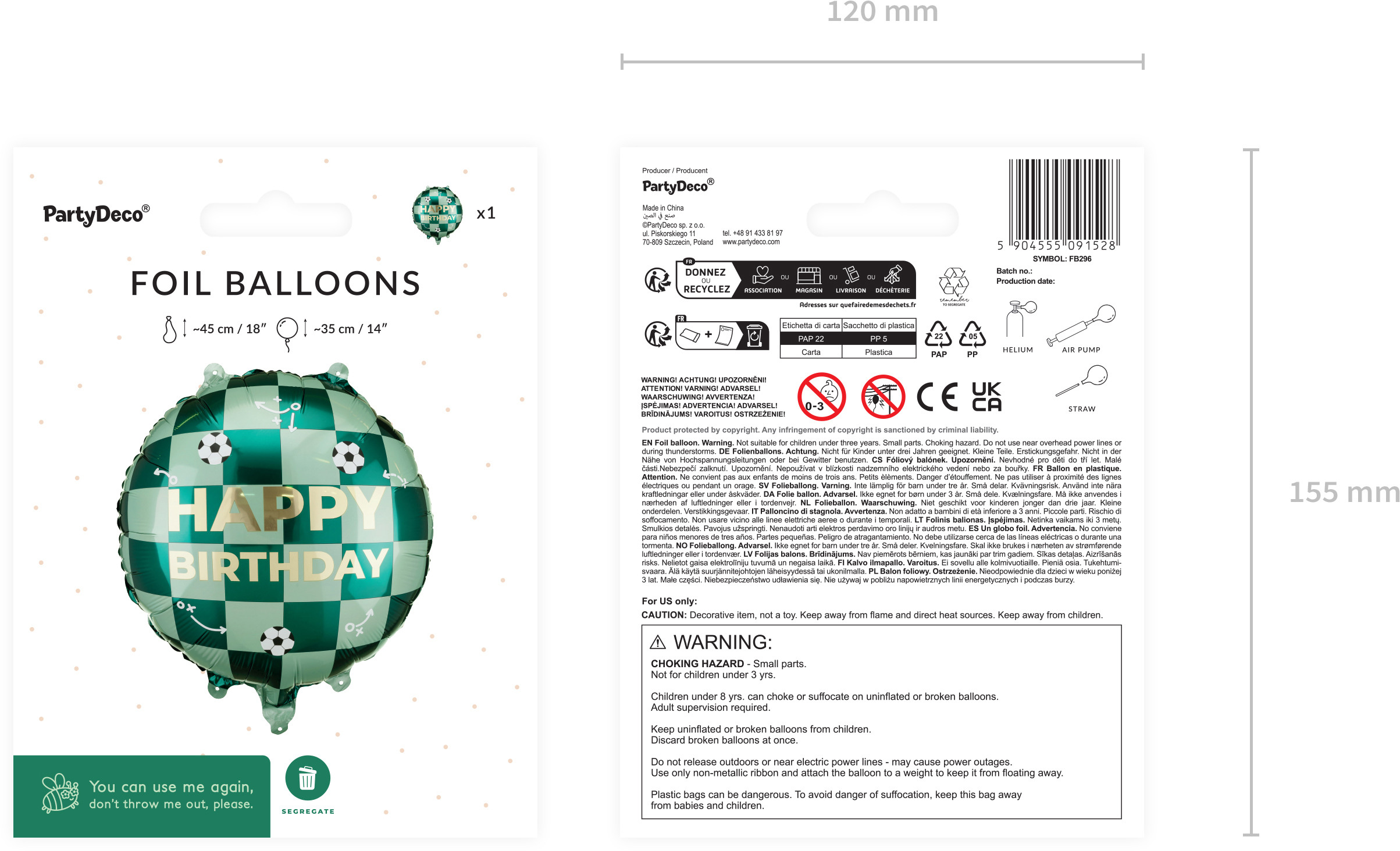 Ballon en plastique avec une inscription "Happy Birthday" et des balles. Dimensions avant le gonflage : environ 45 x 45 cm (18 x 18''). Dimensions après le gonflage : environ 35 x 35 cm (14 x 14''). Le ballon peut être gonflé à l'air ou à l'hélium. Le set contient une paille.