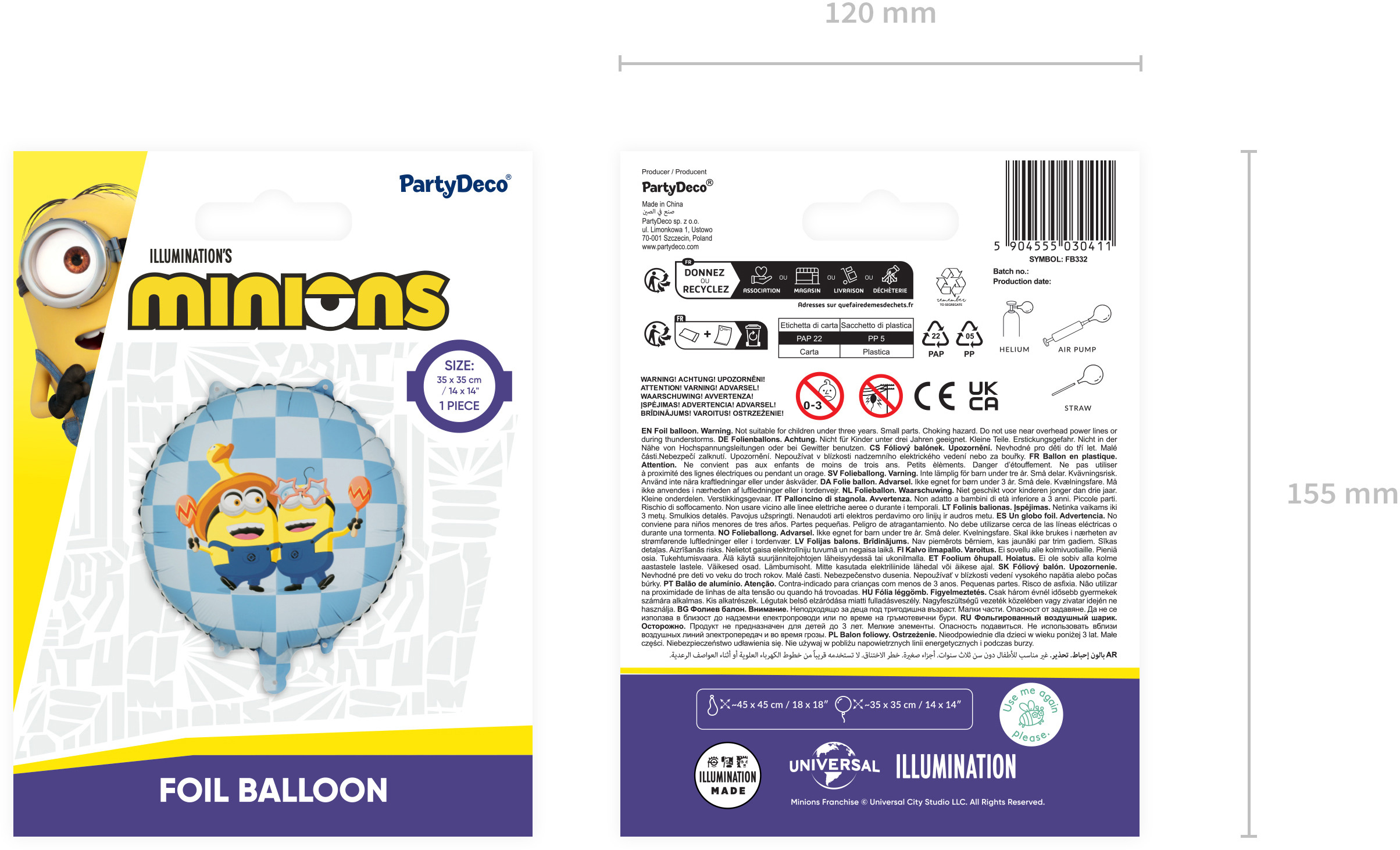 Ballon en plastique Pastille Minions, mélange de couleurs. Dimensions avant le gonflage env. 45 x 45 cm, dimensions après le gonflage env. 35 x 35 cm. À gonfler avec de l'air et de l'hélium. Le set contient une paille.