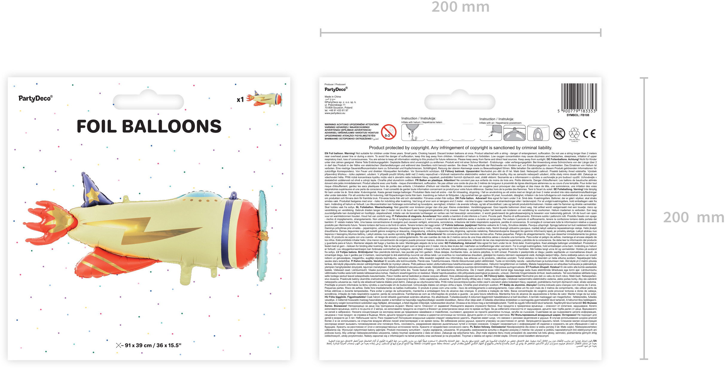 Ballon en plastique mat avion, couleurs mélangées, diamètre après gonflage env. 91 x 39 cm (36 x 15,5''). A gonfler avec de l'air ou de l'hélium.