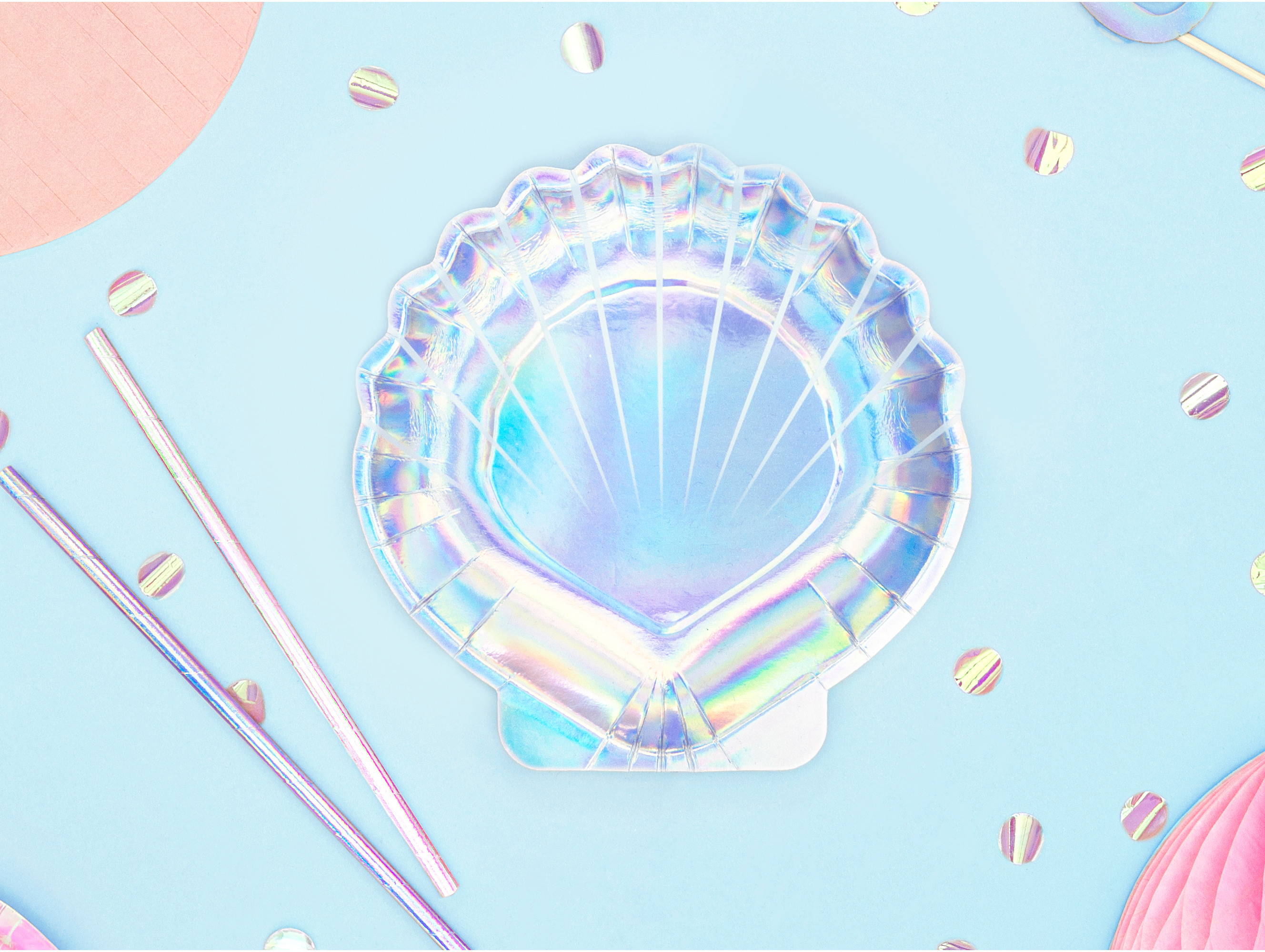 Assiette sirène en forme de coquillage en papier irisé. Diamètre env. 18,5 cm.(1 UE / 6 pcs.)