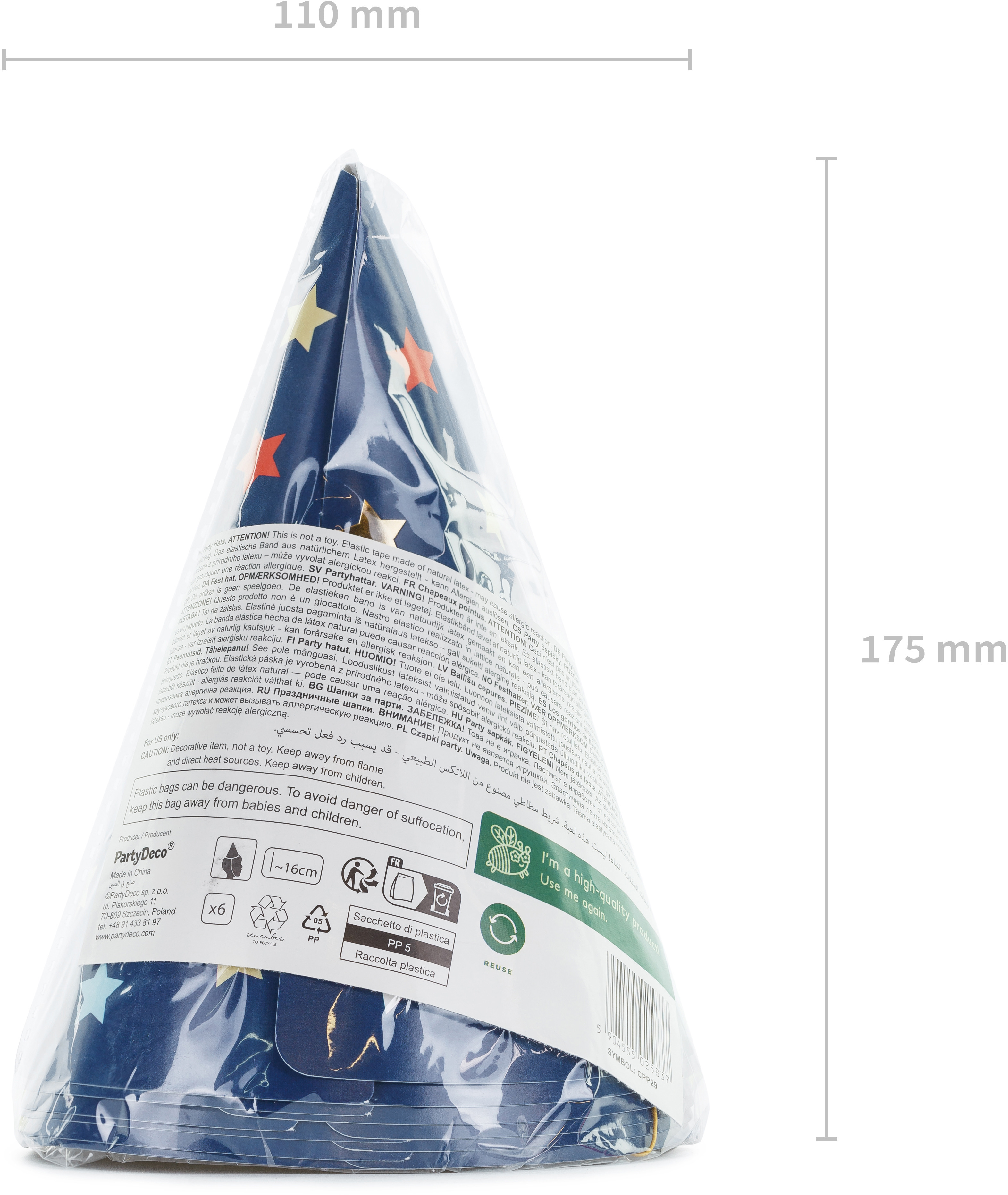 Chapeaux de fête étoiles en papier de couleur bleu marine avec impression d'étoiles multicolores, hauteur env. 16 cm, diamètre env. 11 cm.(1 UE / 6 pcs.)