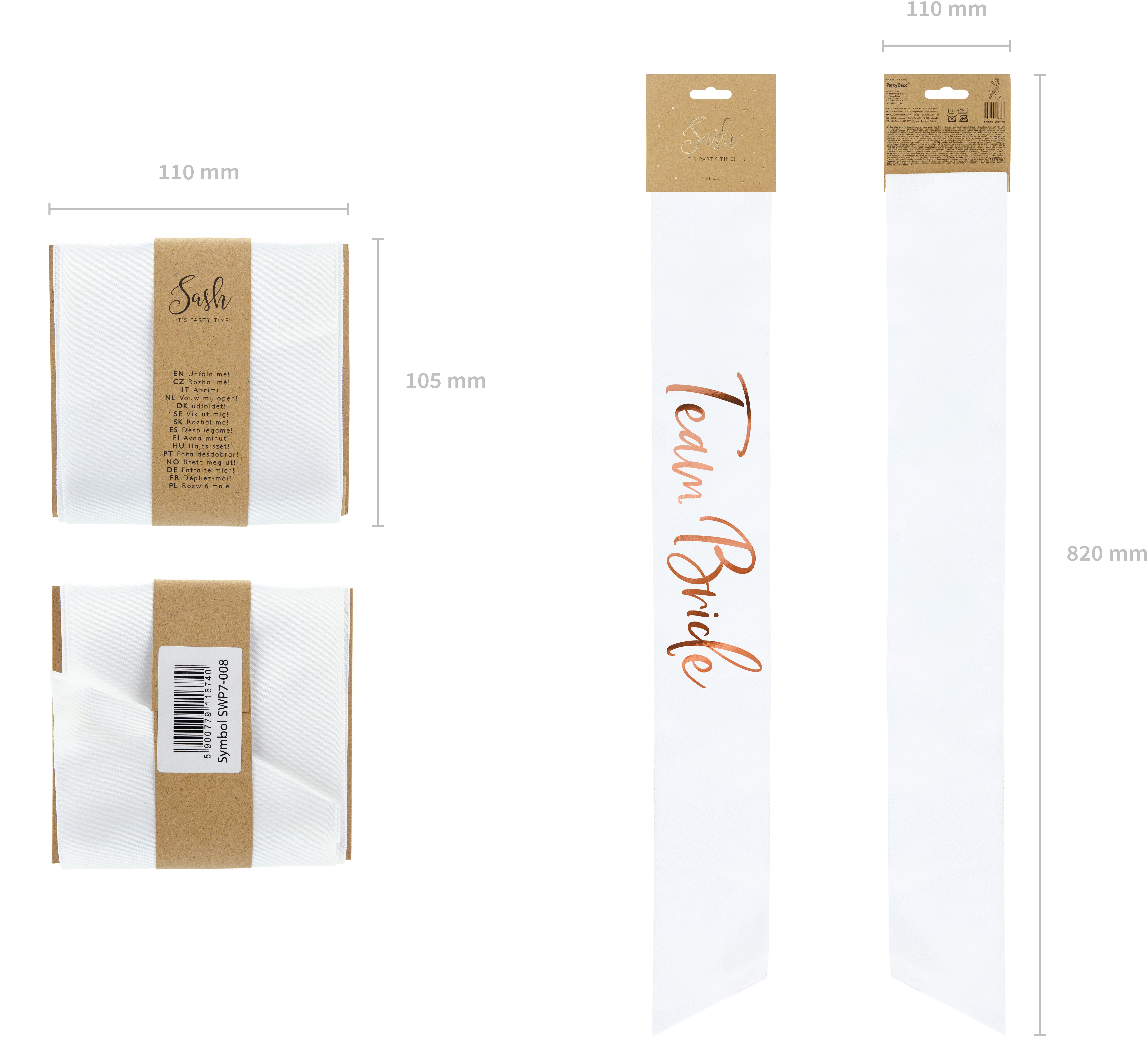 Écharpe de satin Team Bride en blanc avec impression en or rose, environ 10 cm de large et 75 cm de long.