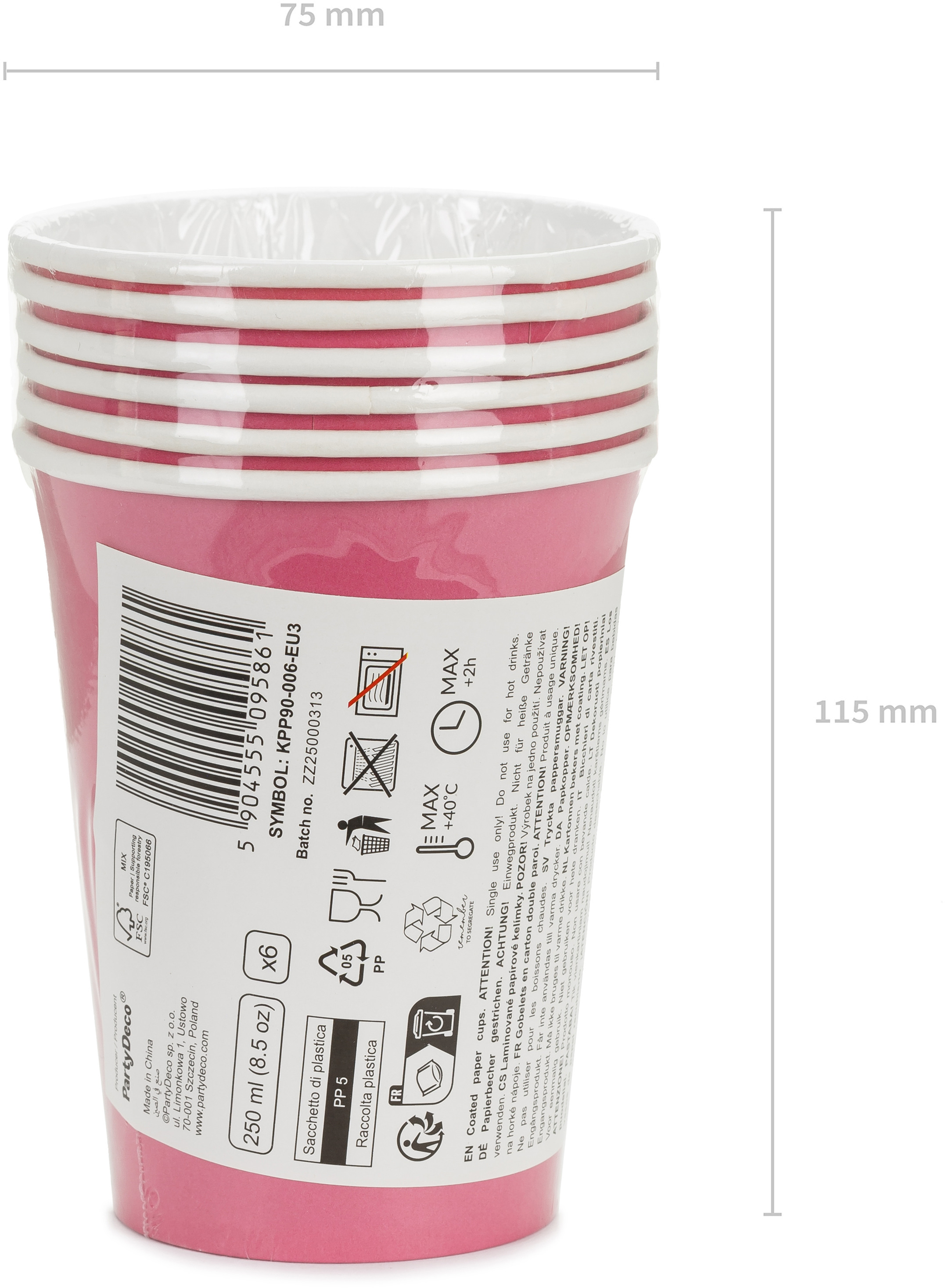Gobelet en carton de couleur rose foncé. Hauteur env. 9 cm, capacité env. 250 ml (8.5 oz). Produit à usage unique. Ne pas utiliser pour les boissons chaudes.Les gobelets contiennent les marquages requis par le règlement d'exécution de la Commission (UE) 2020/2151 du 17 décembre 2020 établissant des exigences harmonisées pour l'étiquetage des produits en plastique à usage unique, énumérés dans la partie D de l'annexe de la directive (UE) 2019/904 concernant la réduction de l'impact de certains produits en plastique sur l'environnement. Le produit contient uniquement une étiquette en polonais, allemand, tchèque, français, néerlandais, slovaque, slovène et bulgare.(1 UE / 6 pcs.)