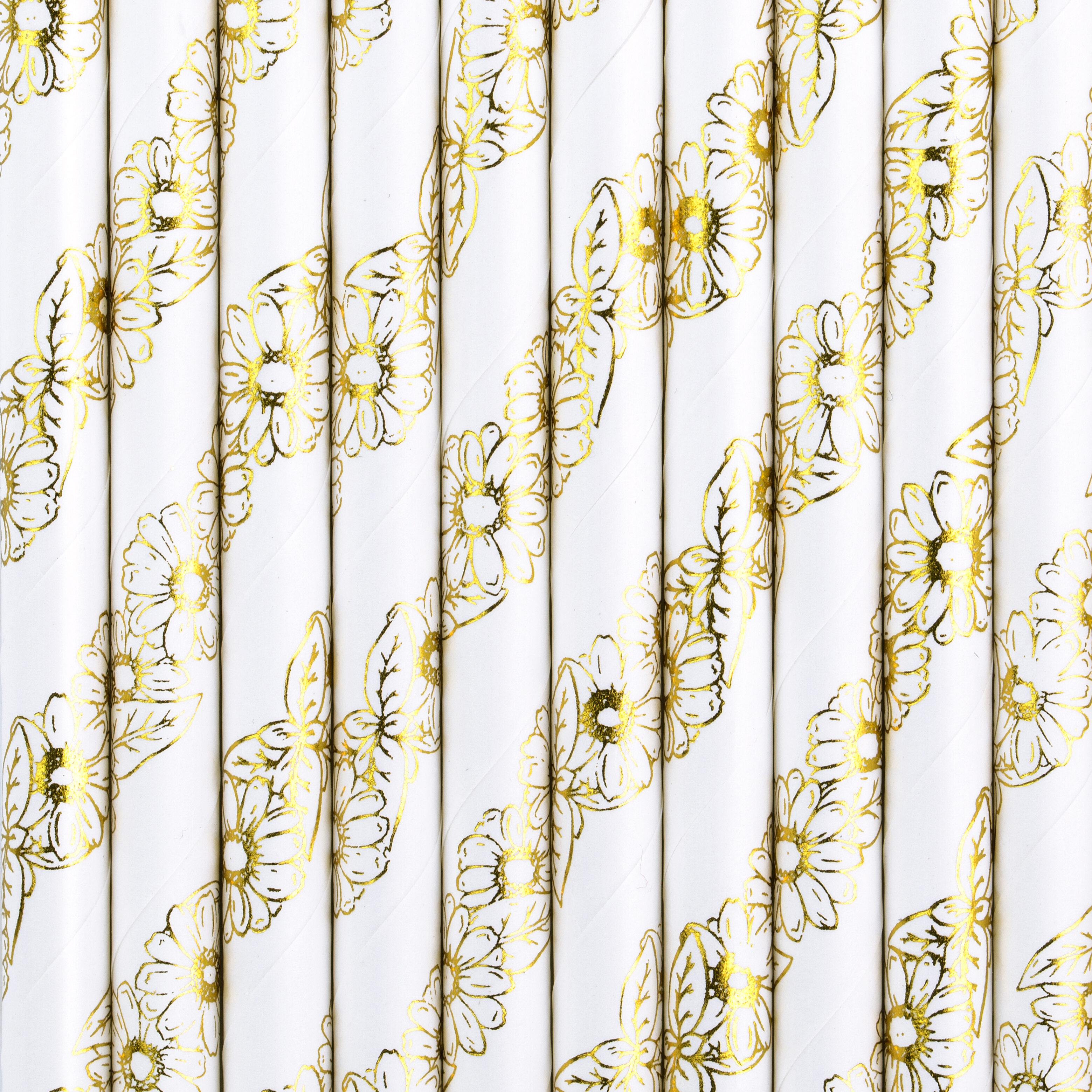 Die Papierstrohhalme in Weiss mit goldmetallisierten Gänseblümchen setzen elegante Akzente bei jeder Feier und sorgen für einen zarten, frühlingshaften Look. Mit einer Länge von etwa 19,5 cm passen sie ideal zu verschiedenen Gläsern und Getränken. Bitte beachten: Dieses Produkt darf aufgrund gesetzlicher Bestimmungen nicht in Deutschland und der Schweiz verkauft werden, entspricht jedoch vollständig den EU-Richtlinien und ist innerhalb anderer EU-Länder regulär nutzbar. In jeder Verpackungseinheit sind 10 Stück enthalten.