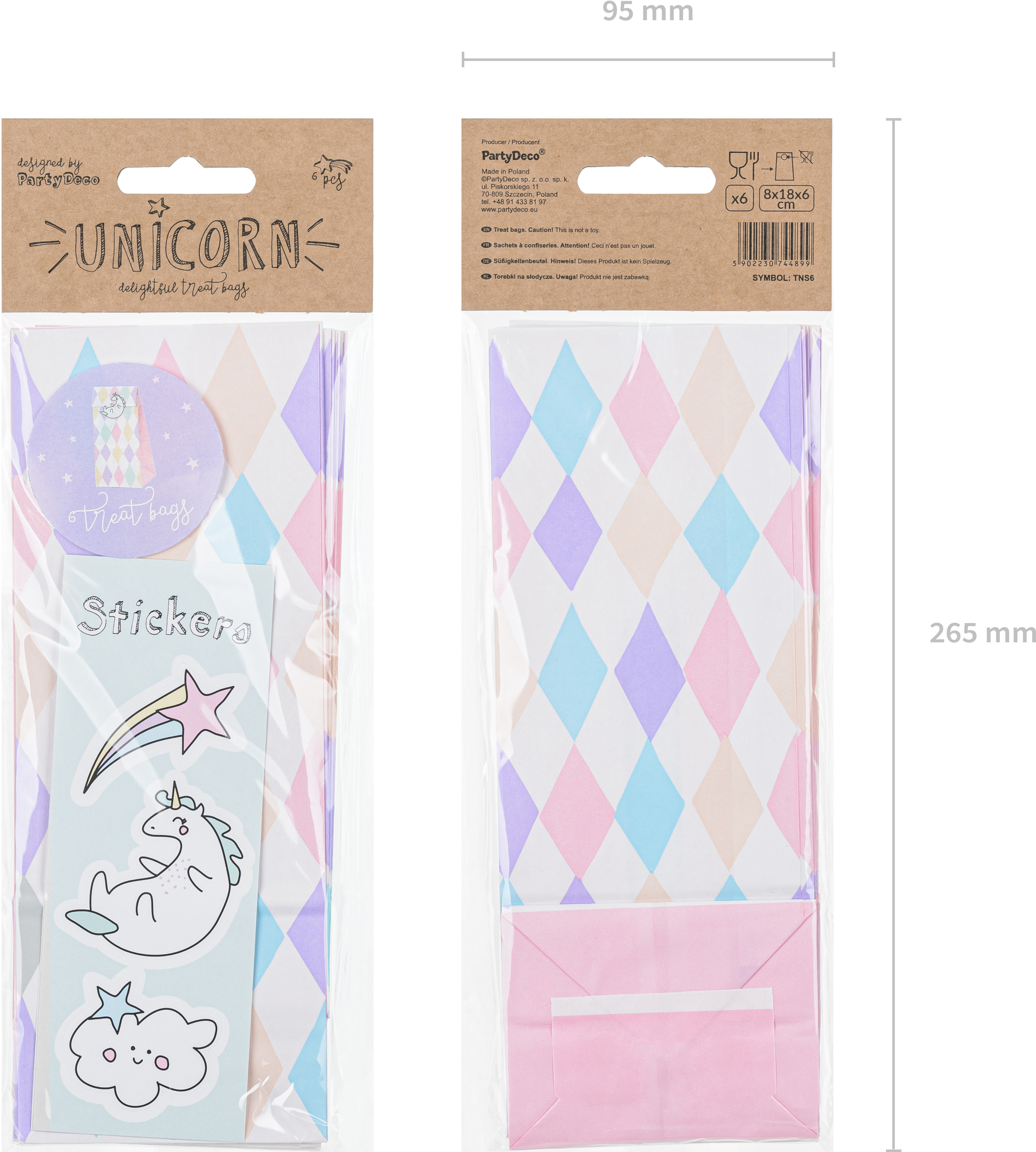 Sachets de bonbons licorne, set composé de 6 sachets imprimés et de 6 autocollants, dimensions après pliage env. 8 x 18 x 6 cm.(1 UE / 6 pcs.)
