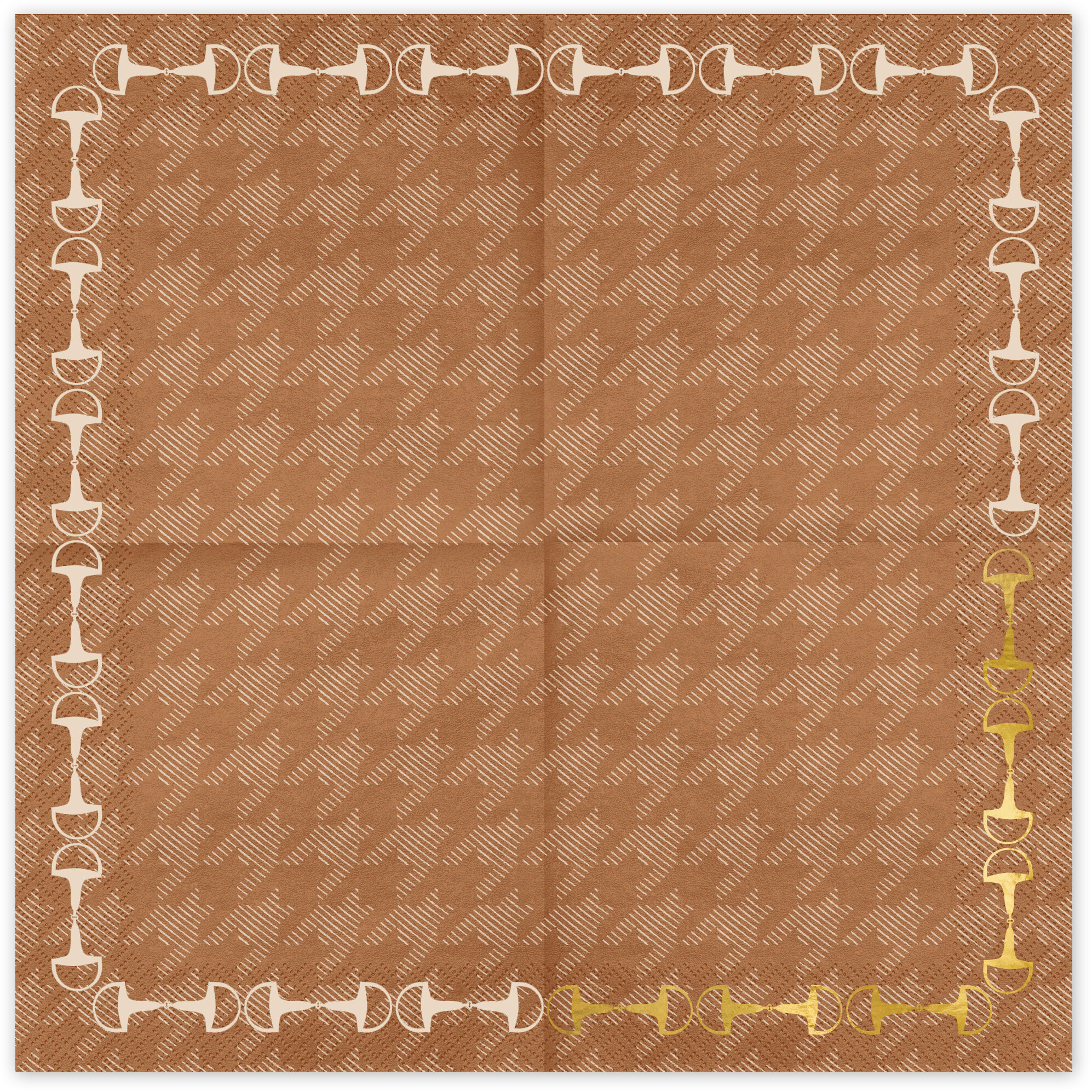 Passend zum Thema Pferd dürfen diese braune Papierservietten mit Hahnentrittmuster und glänzendem Golddruck von Steigbügeln nicht fehlen. Abmessungen im ausgeklappten Zustand ca. 33 x 33 cm, im zusammengefalteten Zustand ca. 16,5 x 16,5 cm.