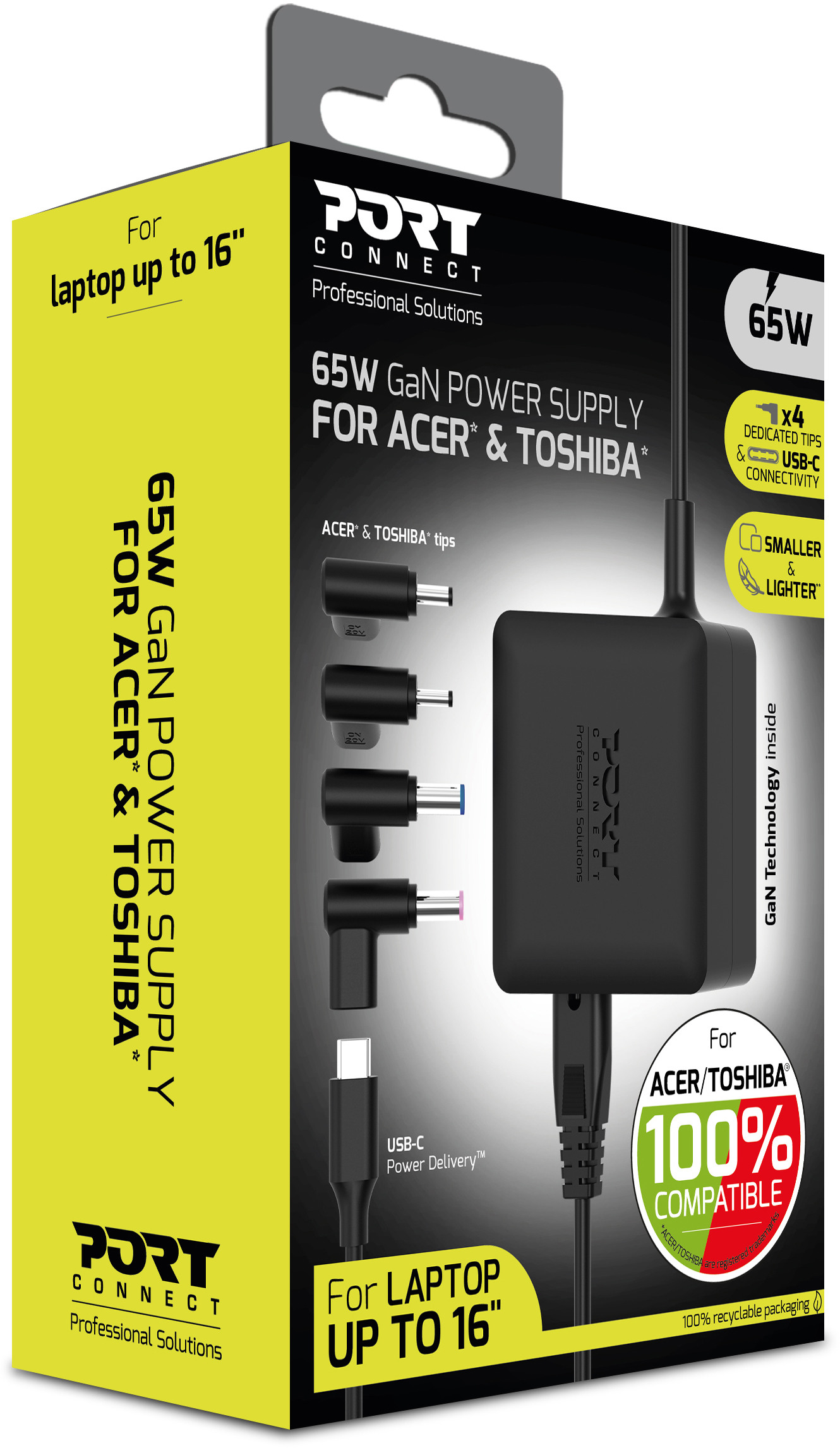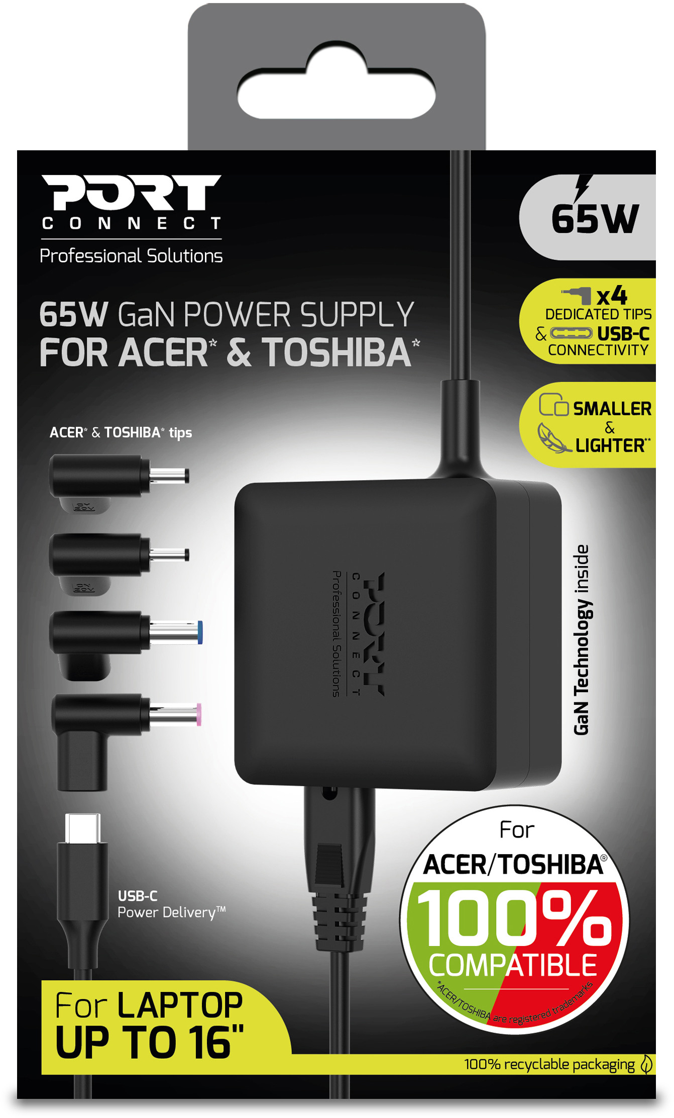 - Puissance de sortie de 65 W : charge rapide et fiable pour les ordinateurs portables ACER®/TOSHIBA® jusqu'à 16 pouces et les appareils USB-C compatibles
