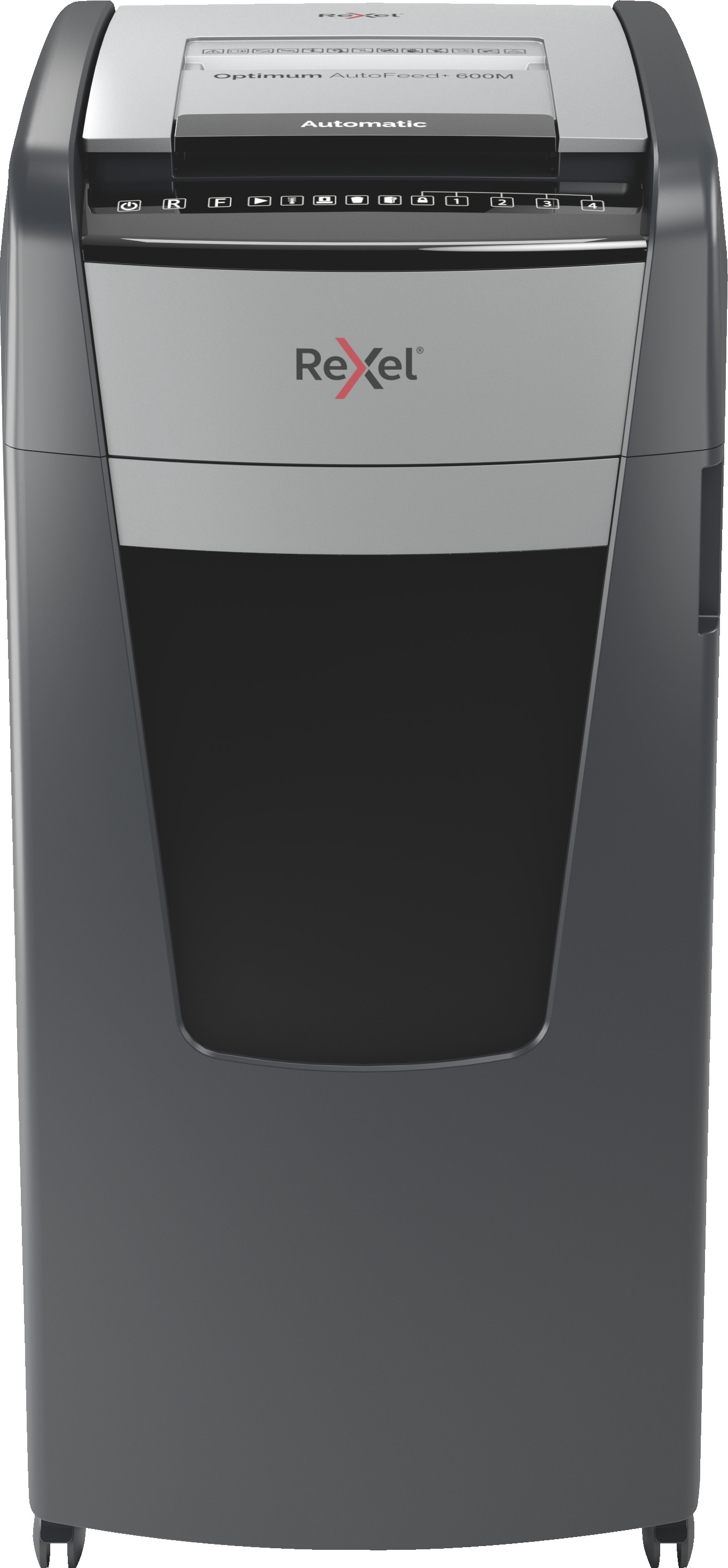 Optimum AutoFeed+ 600M Destructeur automatique de documents, 600 feuilles automatique, niveau de sécurité P5, micro coupe, pour grands bureaux, corbeille de 110 litres, avec roulettes pivotantes, 2020600MCH