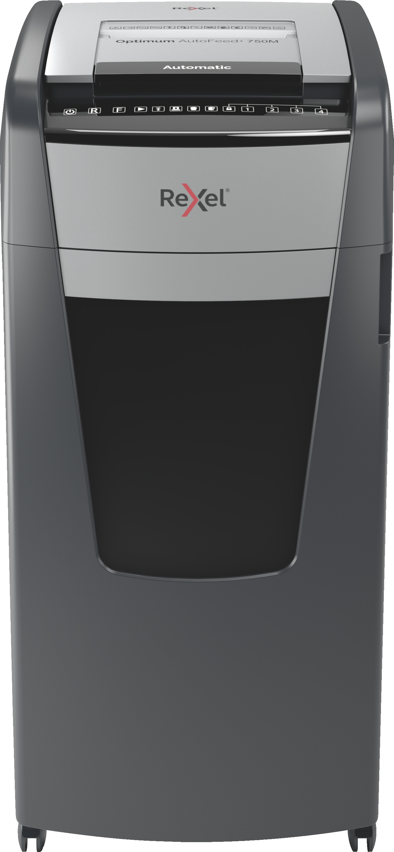 Optimum AutoFeed+ 750M Destructeur automatique de documents, 750 feuilles automatique, niveau de sécurité P5, micro coupe, pour grands bureaux, corbeille de 140 litres, avec roulettes pivotantes, 2020750MCH