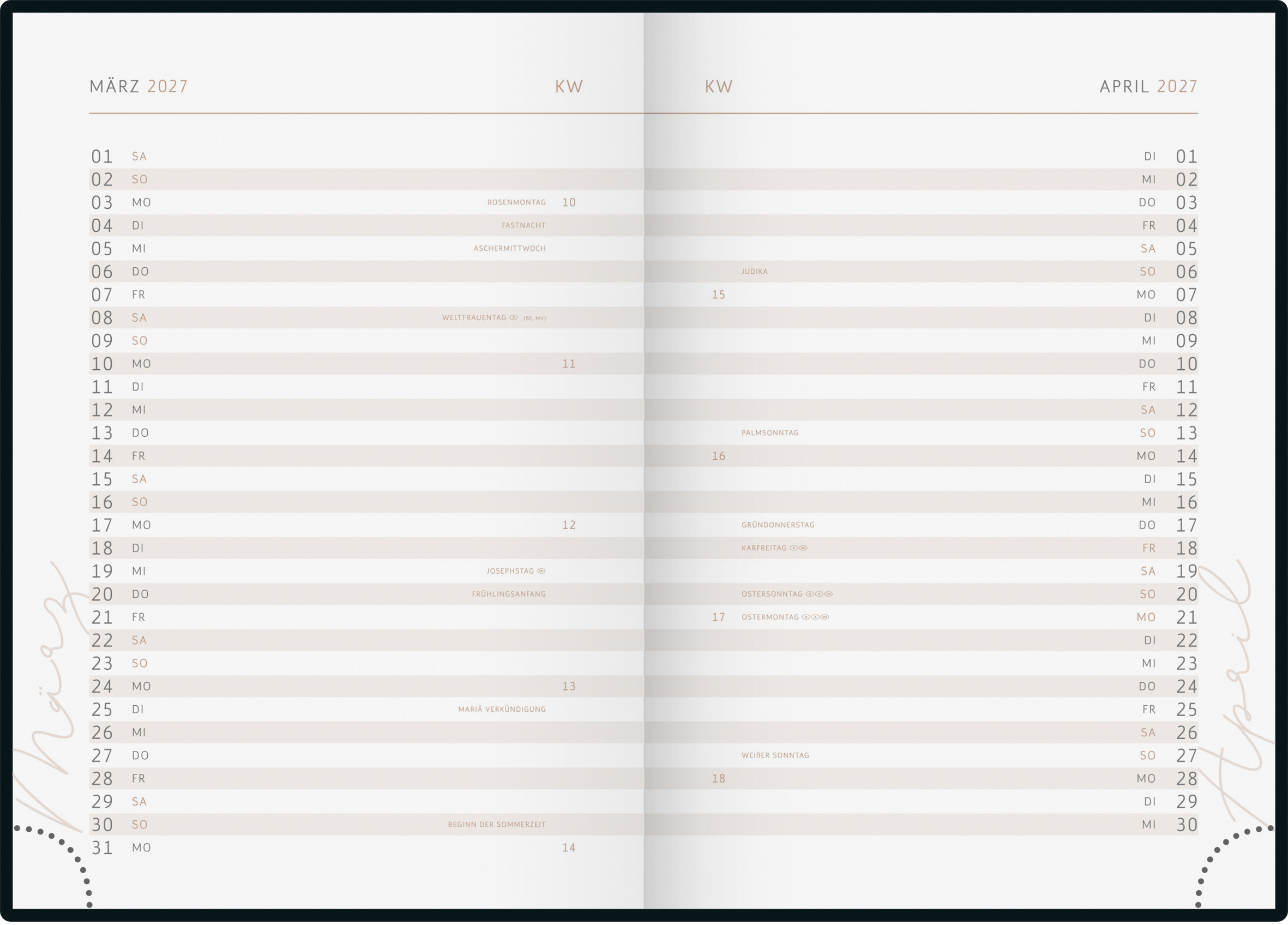 Gardez un œil sur vos rendez-vous avec ce calendrier Design Line de RIDOIDÉ. Format pratique, en langue allemande, avec 1 semaine / page. Planifiez votre année avec style et élégance !