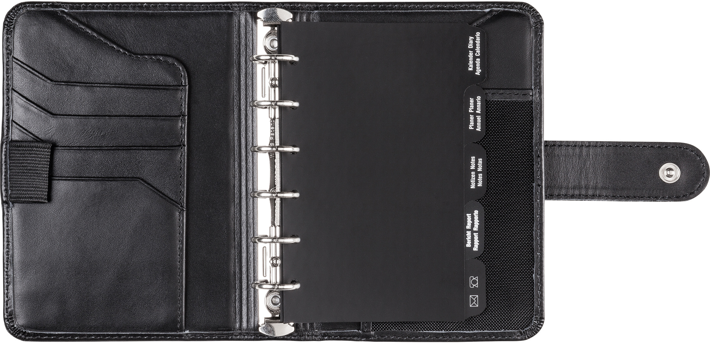 • Intérieur droit : grand coin de serrage, œillet rond pour instruments d'écriture, poches à fentes pour cartes de visite