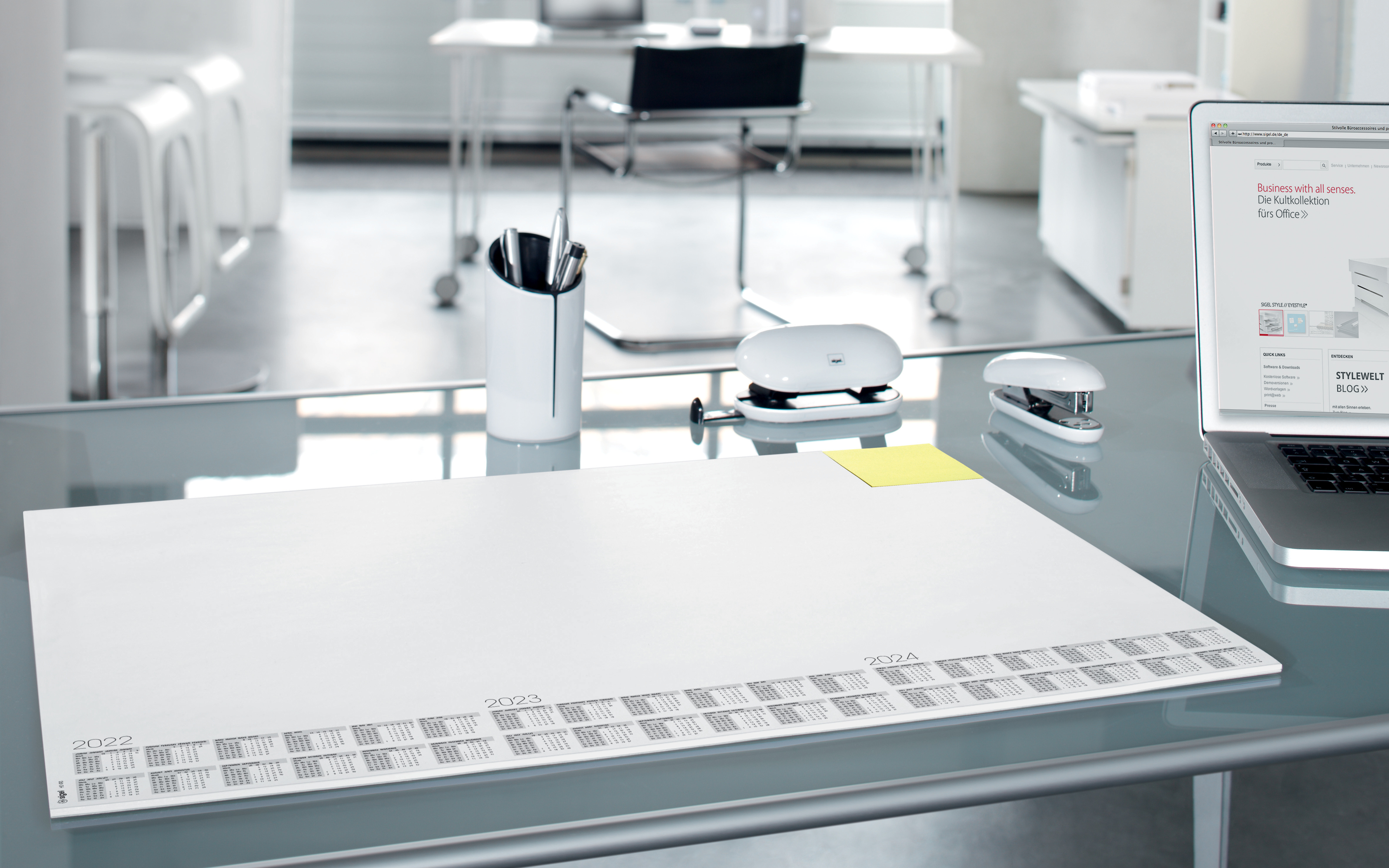 Sous-main avec calendrier actualisé sur 3 ans, en papier de haute qualité. L'encollage stable sur le bord inférieur et partiellement sur le bord supérieur empêche de manière fiable que les coins ne se plient. La couverture arrière stable assure une bonne planéité.