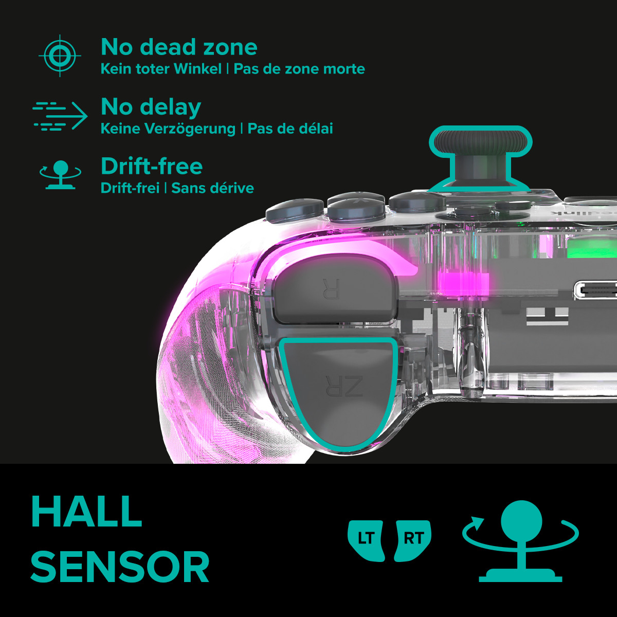 Le gamepad sans fil Rait NX ne se distingue pas seulement par son aspect transparent impressionnant et son éclairage RGB stylé, mais aussi par la technologie de pointe des capteurs à effet Hall dans les sticks analogiques et les gâchettes pour un contrôle précis. Que ce soit sur PC, PS3®, Nintendo Switch® ou Android, le RAIT NX établit de nouvelles normes en matière de performance et d'expérience de jeu grâce à une polyvalence exceptionnelle et une fabrication robuste. La compatibilité avec DirectInput® et XInput ainsi que la connexion au choix par Bluetooth, radio ou câble offrent une flexibilité ultime. La batterie Li-Ion intégrée rechargeable de 600mAh fournit une puissance de longue durée, de sorte que le plaisir de jouer ne connaît pas de limites.La double vibration garantit une expérience de jeu immersive. Les deux touches supplémentaires programmables sur la face inférieure permettent d'enregistrer des macros. Le gamepad sans fil RAIT NX transforme chaque jeu en une expérience inoubliable !