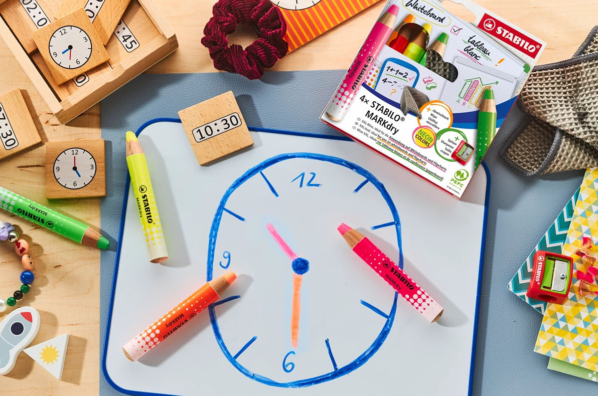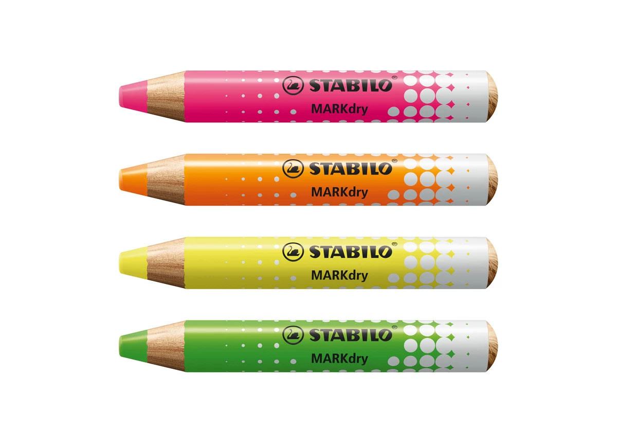 Le marqueur pour tableau blanc MARKdry Neon en set de 4, taille-crayon et chiffon d'essuyage inclus, spécialement conçu pour les tableaux blancs et les flipcharts.