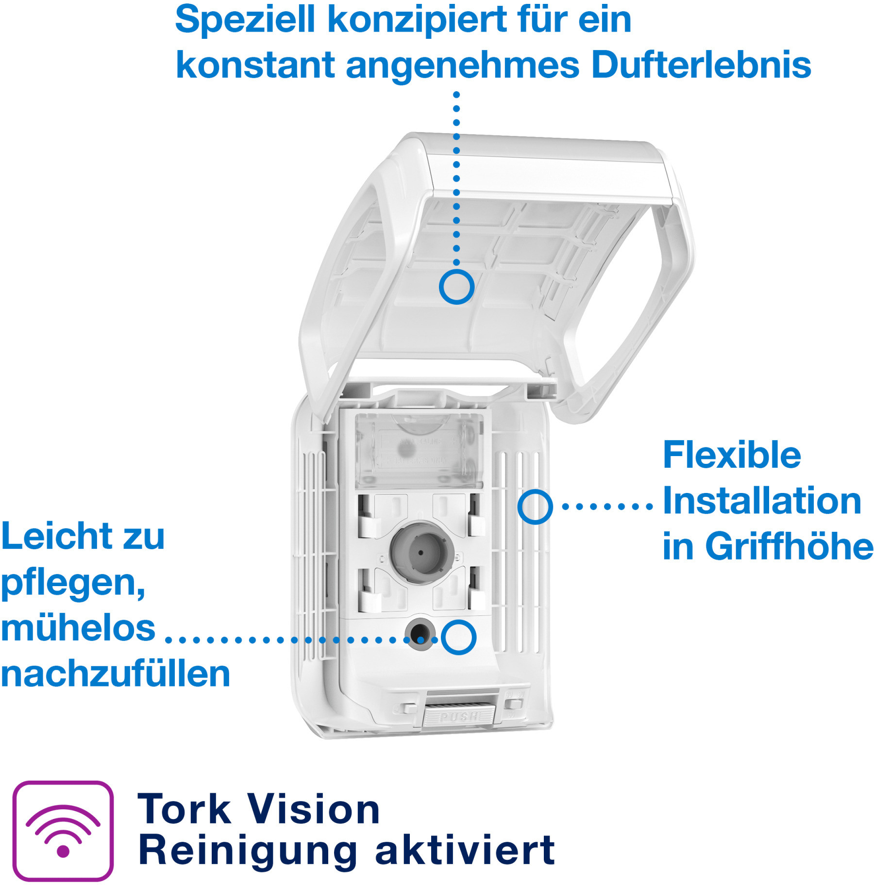 Le distributeur de désodorisant continu Tork au design Elevation diffuse le parfum de manière continue et homogène grâce à une technologie de nébulisation unique. Certifié facile à utiliser pour un remplissage aisé. Disponible en trois parfums soigneusement sélectionnés - Brise de printemps, Rêve floral et Neutralisateur d'odeurs - pour une fraîcheur continue et durable dans les toilettes. Un positionnement flexible à une hauteur facilement accessible pour le personnel d'entretien signifie qu'aucun équipement de travail spécial n'est nécessaire et qu'il n'y a pas de frais d'entretien supplémentaires.