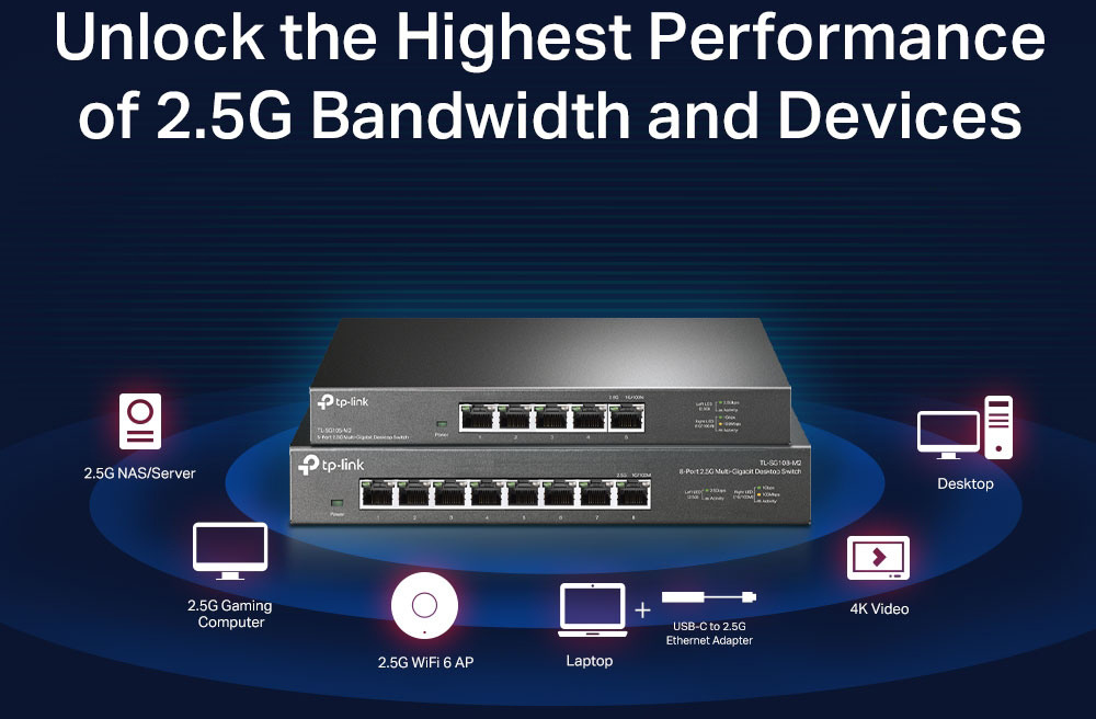 - Huit ports 2,5 Gbit/s. Les ports 8 × 2,5 Gigabit débloquent les performances les plus élevées de votre bande passante et de vos appareils Multi-Gigabit, et fournissent jusqu'à 40 Gbit/s de capacité de commutation.