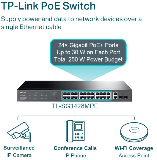 Le TL-SG1428PE est entièrement compatible avec les appareils PoE, tels que les caméras IP, les points d'accès et les téléphones IP. Il fonctionne également avec des périphériques câblés non PoE pour fournir des connexions gigabit, tels que des PC, des imprimantes et IPTV. La conformité à la norme PoE + 802.3af / at prend en charge jusqu'à 30 W sur chaque port PoE. Le budget d'alimentation PoE total de 250 W * pour les ports PoE + 24 × gigabit en fait un large éventail d'applications, telles que la surveillance, les bureaux, les dortoirs et les petites entreprises. Il est entièrement compatible avec les caméras IP, les points d'accès, les téléphones IP, les ordinateurs, les imprimantes, etc.