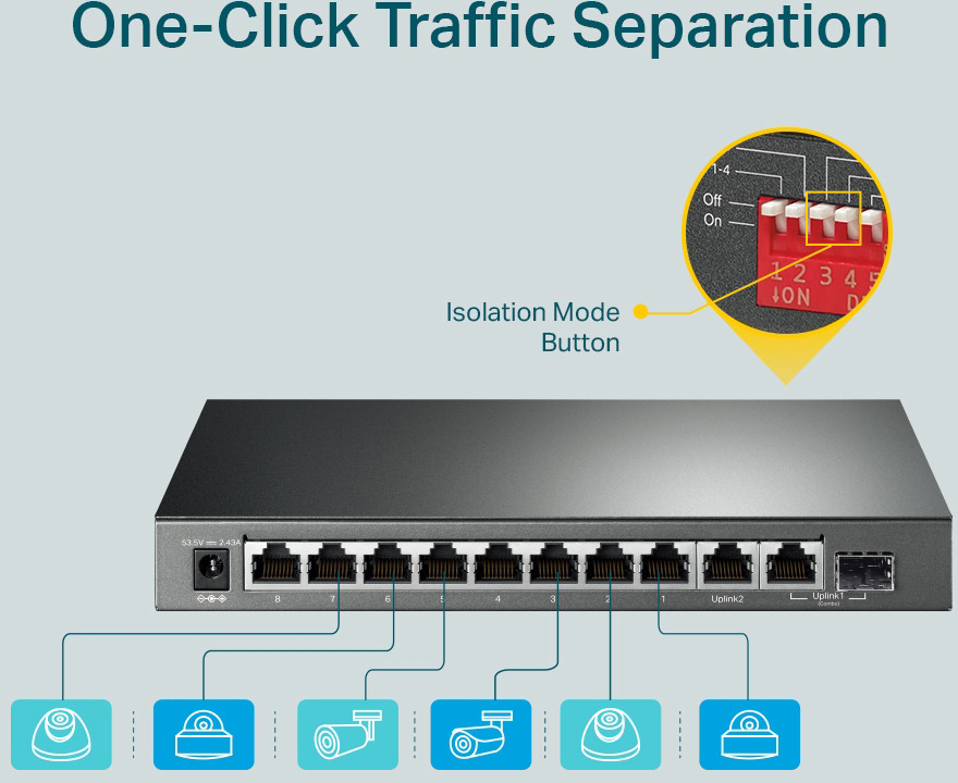 TP-Link TL-SG1210MP est un switch non administré avec 9 ports RJ45 gigabit et 1 port combo SFP/RJ45 Gigabit qui ne nécessite aucune configuration. Avec 8 ports PoE (Power over Ethernet), il peut détecter et alimenter automatiquement tous les appareils alimentés (PD) conformes à la norme IEEE 802.3af/at. Dans cette situation, l'alimentation électrique est transmise avec les données dans un seul câble vous permettant d'étendre votre réseau là où il n'y a pas de lignes ou de prises électriques, où vous souhaitez réparer des appareils tels que des points d'accès, des caméras IP ou des téléphones IP, etc.