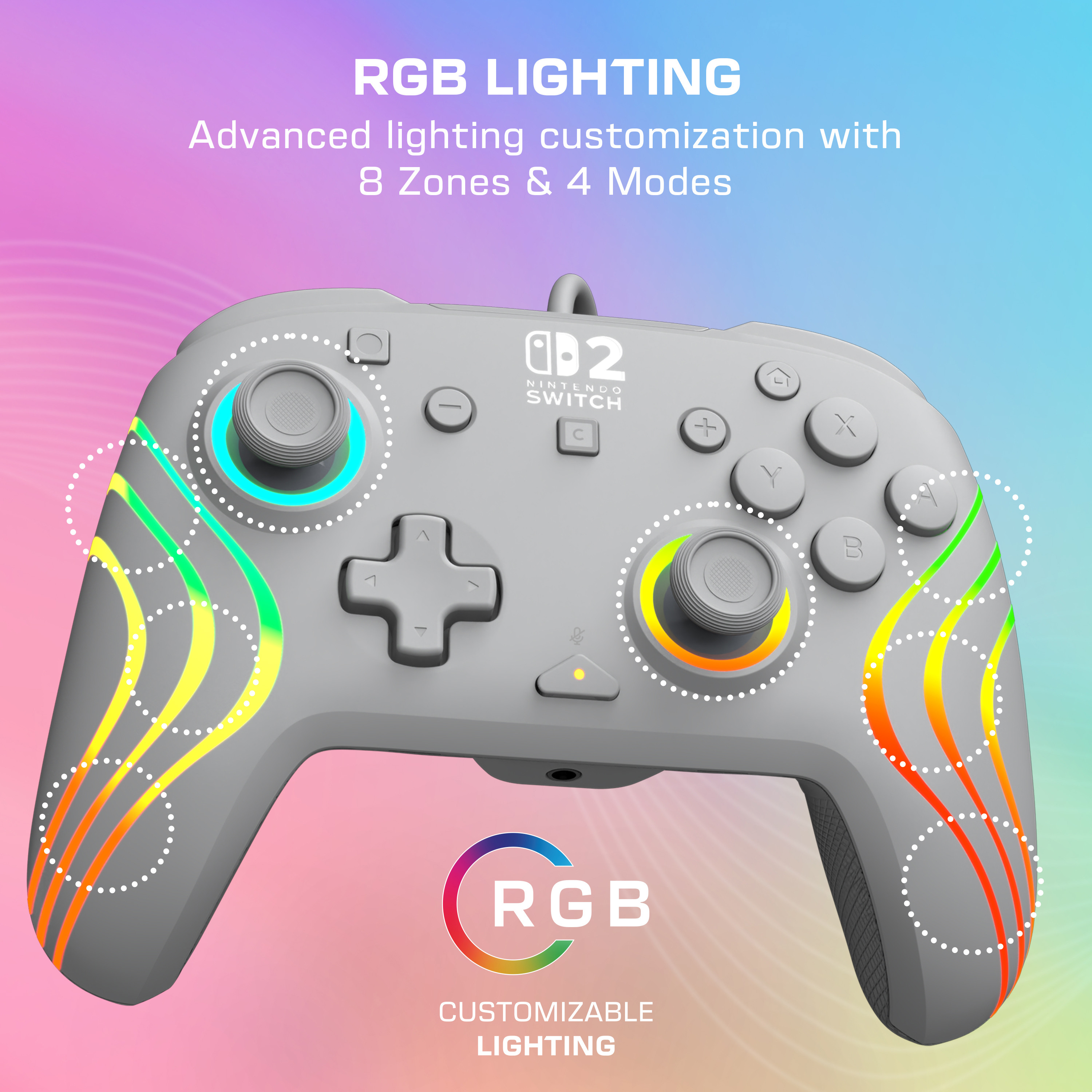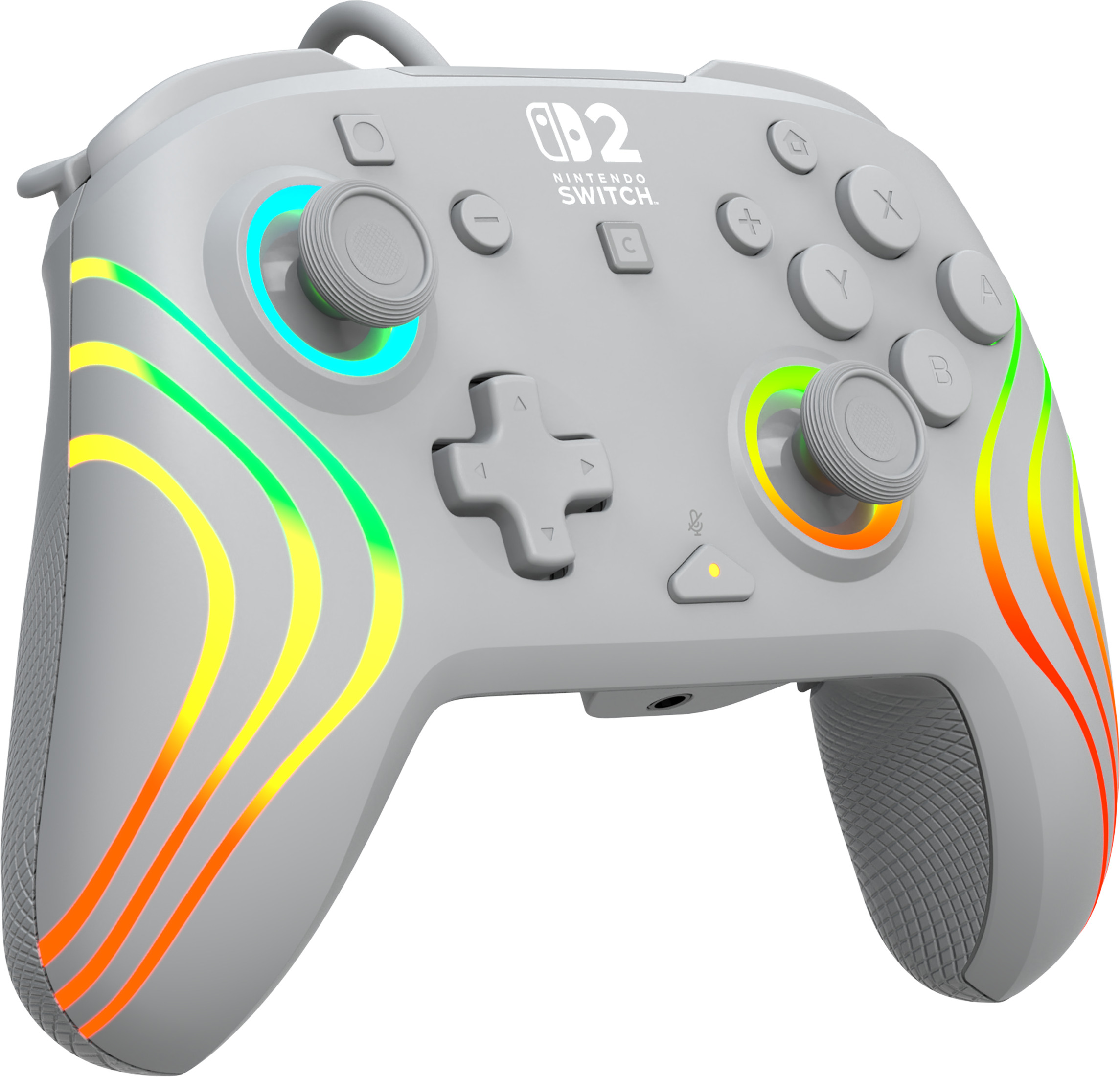 Rends ton expérience de jeu encore plus cool avec la manette de jeu filaire Afterglow Wave RGB pour Nintendo Switch™ 2. Cette manette est également compatible avec la Nintendo Switch™ et la Nintendo Switch™ - modèle OLED. Avec huit zones d'éclairage RVB personnalisables et quatre modes prédéfinis, tu peux facilement adapter l'éclairage de la manette à ton style ou à ton humeur. Les manettes à effet Hall intégrées offrent une précision, une réactivité et une résistance à long terme améliorées, tandis que la prise casque intégrée de 3,5 mm et les commandes audio te garantissent une immersion totale. La touche C, placée de manière pratique, te permet d'accéder rapidement aux fonctions GameChat. Domine chaque match grâce aux touches à assignation rapide à l'arrière, aux poignées texturées et à une connexion câblée sécurisée pour un contrôle ultra-réactif. Montre ton vrai visage et un nouveau style avec la manette de jeu sans fil Afterglow Wave RGB, sous licence officielle de Nintendo®.