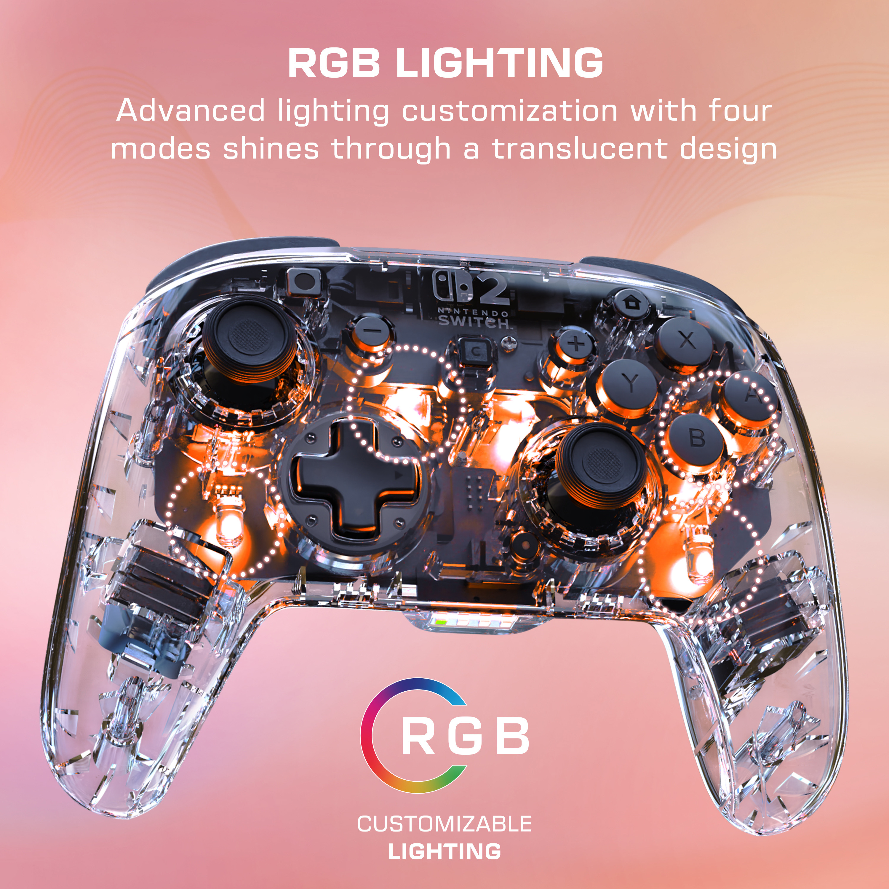 Rends ton expérience de jeu encore plus cool avec la manette de jeu sans fil Afterglow RGB pour Nintendo Switch™ 2. Cette manette est également compatible avec la Nintendo Switch™, la Nintendo Switch™ Lite et la Nintendo Switch™ - modèle OLED. Profite d'un éclairage LED cool avec une luminosité et des couleurs réglables pour 4 modes d'éclairage prédéfinis qui créent une lueur RVB personnalisée. Le design transparent laisse apparaître les circuits internes du contrôleur et lui confère un look élégant et high-tech. Les thumbsticks avec technologie de capteur TMR (Tunneling Magnetoresistance) intégrée offrent précision et résistance, tandis que le contrôle de mouvement intégré améliore la réactivité. La touche C, placée de manière pratique, te permet d'accéder rapidement aux fonctions GameChat. Grâce à la batterie rechargeable, tu peux jouer jusqu'à 40 heures sans fil. Cette manette est sous licence officielle de Nintendo® et offre un look sympa, des performances fiables et un confort tout au long de la journée pour chaque session de jeu.